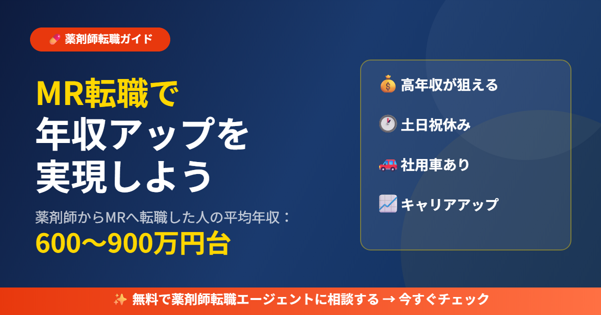 年収アップが見込める:大手製薬会社のMRは年収600〜900万円台も珍しくなく、調剤薬局より大幅アップする場合がある