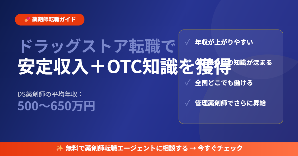 「今の調剤薬局の年収に伸びしろを感じない」「もっと安定した収入とキャリアが欲しい」「OTC医薬品や健康食品の知識を活かして地域住民の役に立ちたい」——そんな想いを抱えている薬剤師の方にこそ注目してほしいのが、ドラッグストアへの転職です。ドラッグストア薬剤師は平均年収500〜650万円と高水準で、OTC医薬品や健康食品、化粧品、介護用品などヘルスケア全般の知識も身につくため、セルフメディケーション時代における薬剤師の市場価値を大きく高められます。さらに全国展開するチェーンが多いため、勤務地の選択肢が豊富で、ライフスタイルに合わせた働き方がしやすいのも魅力。マツキヨココカラ、ウエルシア、ツルハ、サンドラッグ、スギ薬局など大手チェーンが積極採用を続けており、2026年現在も売り手市場が続いています。本記事では、ドラッグストア薬剤師の仕事内容、年収の実態、向いている人の特徴、転職を成功させるための具体的な戦略まで、2026年最新のデータと現場の声をもとに徹底解説します。「失敗しない転職」を実現するために、ぜひ最後までお読みください。