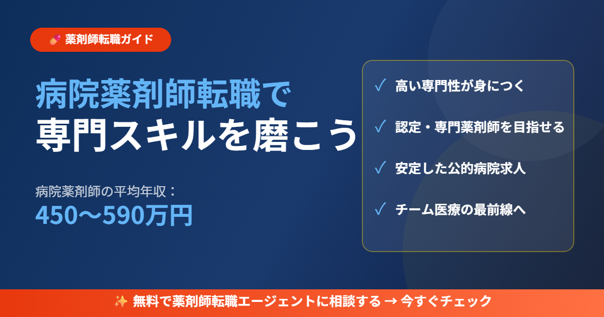 「今の調剤薬局での仕事に物足りなさを感じている」「もっと専門的なスキルを身につけて、薬剤師としてキャリアアップしたい」——そんな思いを持つ薬剤師の方に、今注目されているのが病院薬剤師への転職です。病院薬剤師は、チーム医療の一員として患者さんの治療に深く関わることができ、薬剤師としての専門性を最大限に発揮できる職場として知られています。しかし、「病院薬剤師への転職は難しそう」「具体的に何を準備すればいいかわからない」という方も多いのではないでしょうか。本記事では、病院薬剤師転職を成功させるための全知識を、年収・仕事内容・求人の探し方・エージェント活用法まで、2026年の最新情報をもとに徹底的に解説します。ぜひ最後まで読んで、理想のキャリアへの第一歩を踏み出してください。