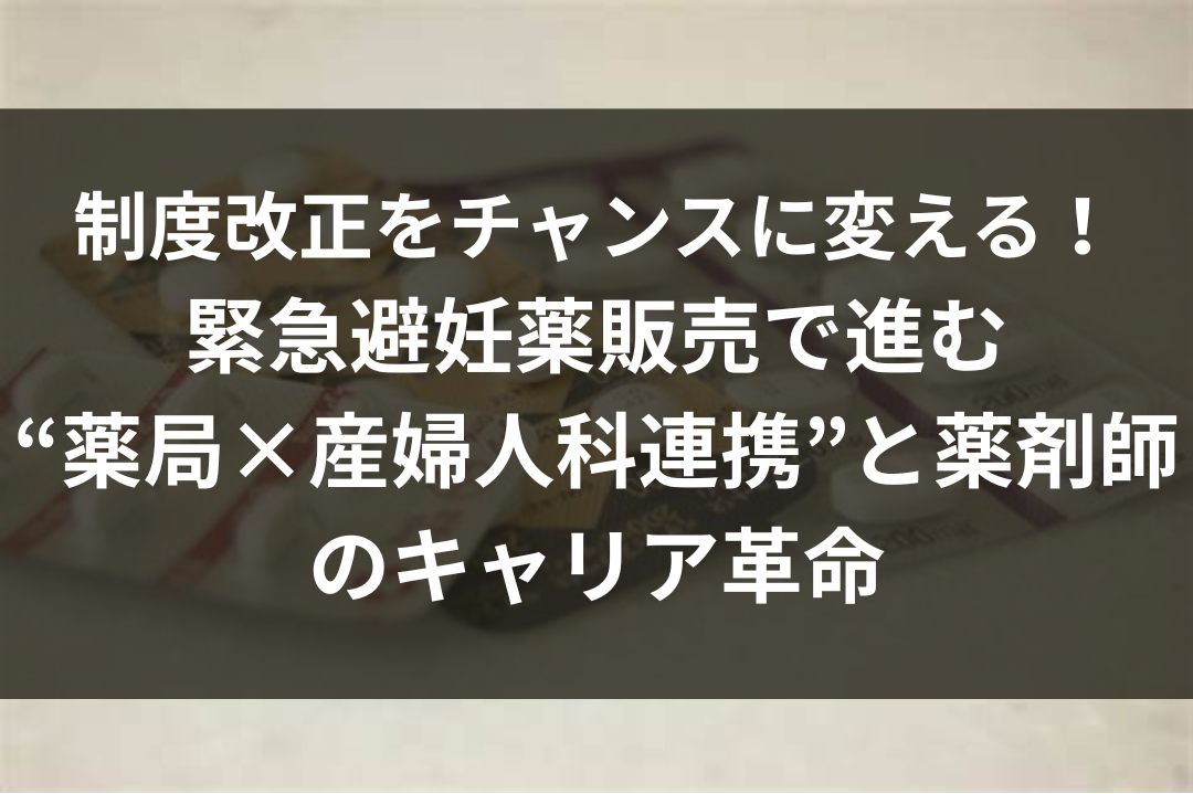 - 例えば、調剤併設ドラッグストア勤務であれば、「緊急避妊薬対応薬局」を目指す店舗で薬局長・管理薬剤師として制度構築を担うというキャリアも想定できます。