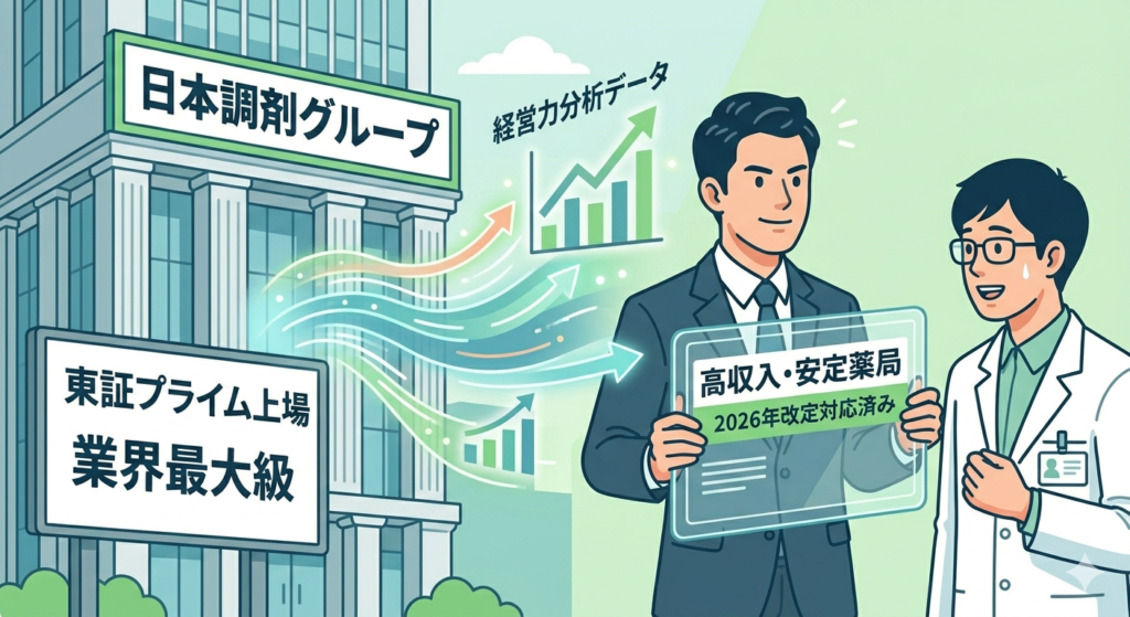 • 2026年の強み:圧倒的な「経営の先読み力」自社グループが全国に店舗を持つため、改定の影響をシミュレーションする精度が他社と桁違いです。「このエリアの薬局は改定でこれくらい減収しますが、在宅特化で収益を維持する計画です」と、法人の5年先まで語れる担当者がいます。